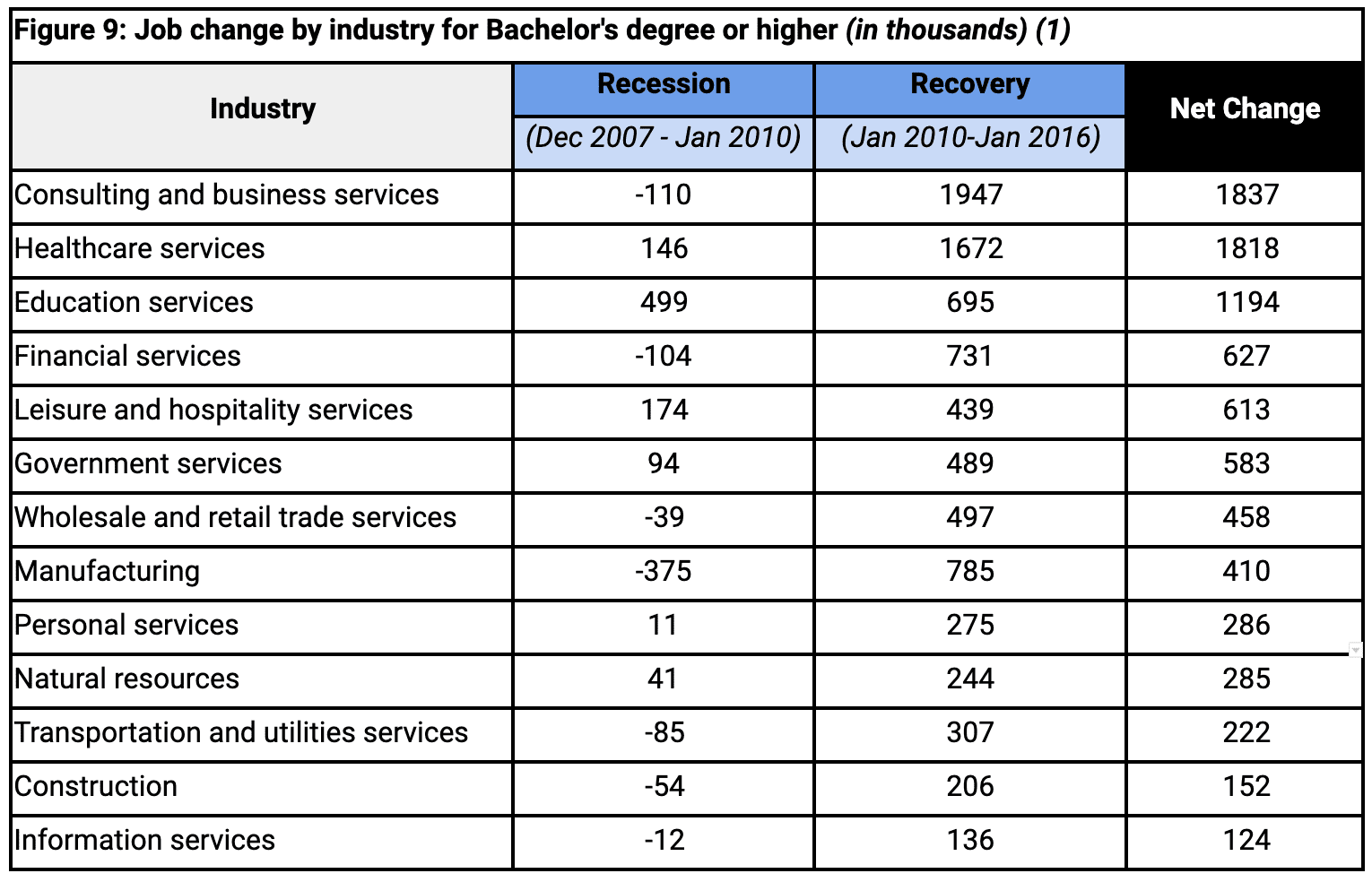 Recessions underscore the value of a college education. During the recovery from the Great Recession, 11.5 of the 11.6 million jobs that were added back to the economy went to workers with at least some college education. As Figure 1 shows, the value of persisting through college was realized as bachelor’s degree holders gained the most jobs during the recovery (1).