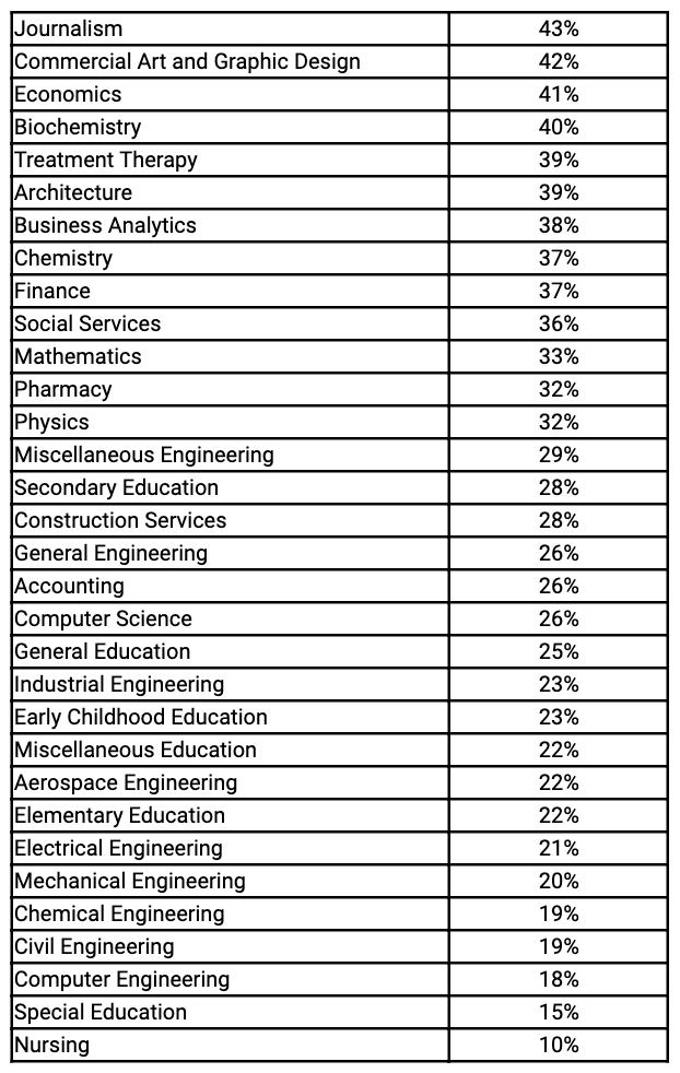 The NY Fed found that college major significantly correlated with the probability of being underemployed. Three types of majors had the lowest predicted probabilities of unemployment: 1) STEM and quantitative majors (e.g., engineering, business analytics), 2) Occupation-training majors (e.g., nursing, accounting), and 3) Majors geared towards growing parts of the economy (e.g., education) (3).