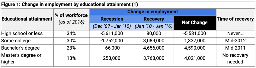 During the Great Recession and recovery, those with a college degree gained almost 2M middle-skill jobs while high school graduates lost ~1M middle-skill jobs (1).