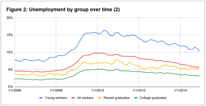 Research by the Federal Reserve Bank of New York further demonstrates the value of persisting through college by comparing unemployment and underemployment outcomes by four worker groups: 1) all workers (aged 16-65), 2) young workers (22-27 year olds without a college degree), 3) recent graduates (22-27 year olds with a college degree), and 4) college graduates (22-65 year olds with a college degree).