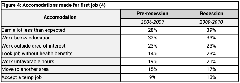 To understand the concessions made for a first job during the Great Recession, Rutgers University surveyed 2006-2007 college graduates (representing non-recession graduates) and 2009-2010 college graduates (representing recession graduates). Despite higher rates of underemployment for the 2009-2010 graduates, both groups felt similarly, at 32-33%, that their first job was below their education. The major difference between the two was the percentage of respondents who felt they were earning less than expected grew from 28% to 39% (4).