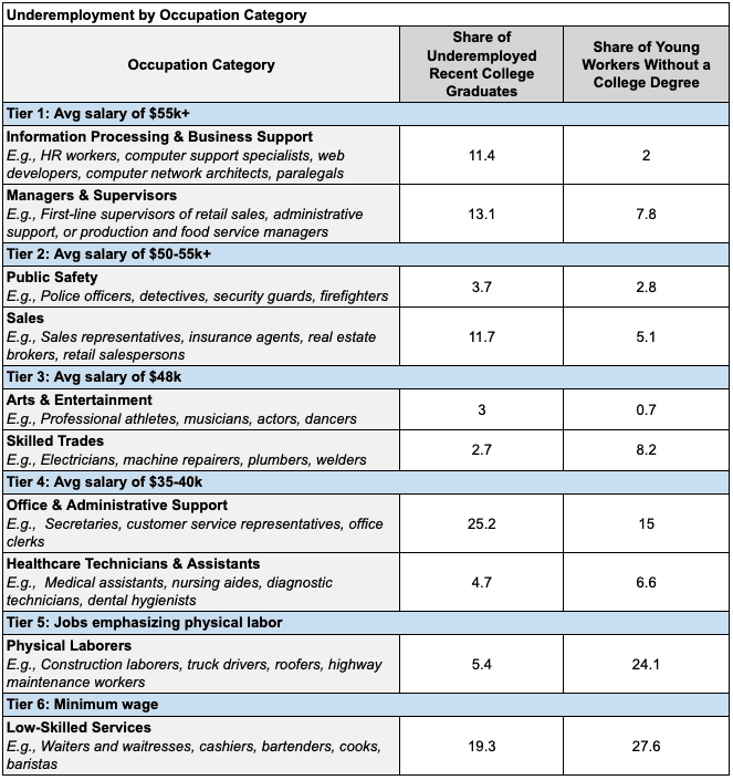 During the Great Recession, underemployment was associated with media depictions of college graduates working as baristas. Evidence has proven that image unfounded; most underemployed recent college graduates were in relatively well-paid non-college positions. About half were in jobs with an average salary of $48k+ a year, and ~75% were in jobs with an average salary of $35K+ per year (3). A table of average salaries of underemployed recent graduates by occupation is in the appendix.