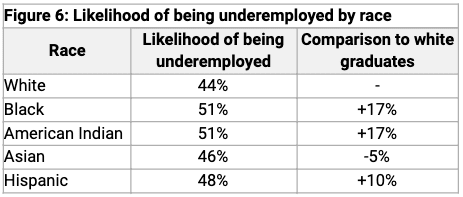 Research has shown that minorities – particularly Black and Hispanic men – suffer the most job setbacks during recessions. This continues to hold true when looking at the recent college graduates segment, which shows higher likelihoods of being underemployed for non-white graduates (3).