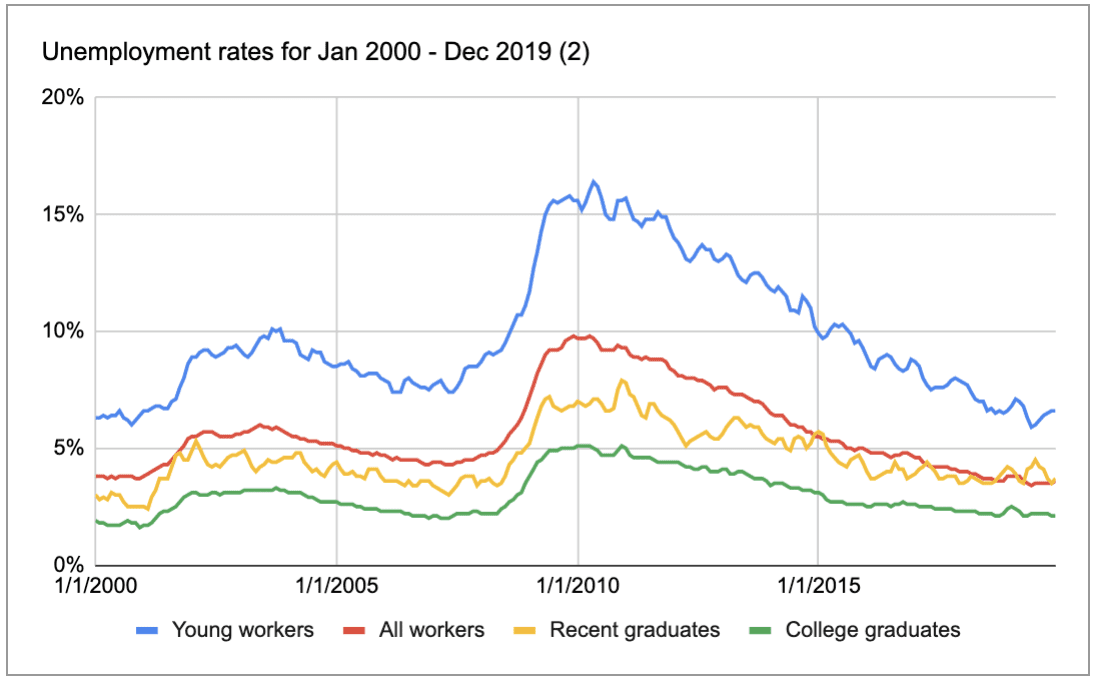 Even a decade after the Great Recession, the unemployment rate of recent college graduates was higher than both the early 2000s and pre-Great Recession levels in 2006-2007.