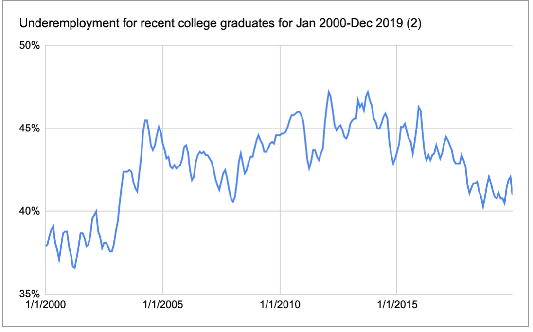 Furthermore, while underemployment rates for recent college graduates were on a downward trend through the end of 2019, they were still higher than in the early 2000s. ~40% of recent graduates were in a job that did not require their degree (2).