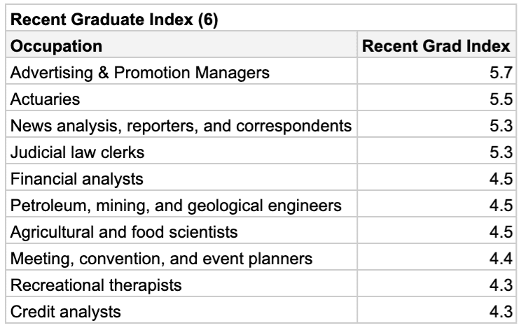 First, it is important to recognize that the recent graduate market does not necessarily resemble the job market at large as recent college graduates cluster into certain types of roles. The “recent grad index” calculates the share of recent graduates in an occupation divided by the share of all workers in an occupation. As expected, recent graduates are clustered in entry-level roles like “news analysis” and “financial analysts” (6).