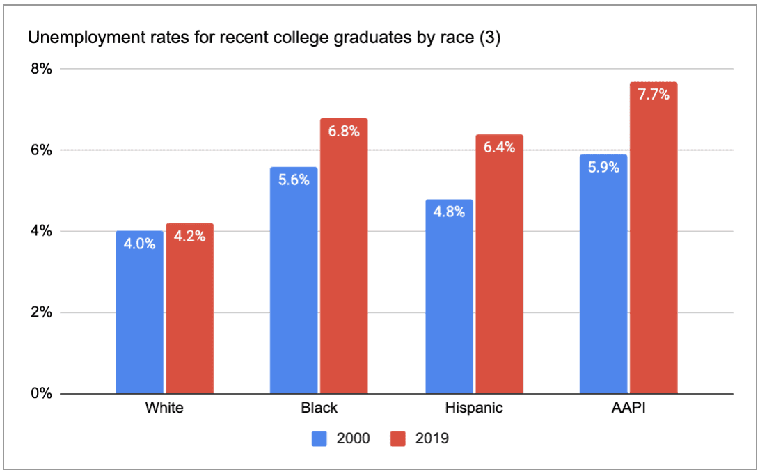 The Economic Policy Institute compared 2000 and 2019 unemployment rates for recent college graduates aged 21-24 without an advanced degree. Unemployment was higher in 2019 than in 2010 for all races, ranging from 0.2 p.p. higher for white graduates to 1.8 p.p. higher for Asian American and Pacific Islander recent graduates (3).