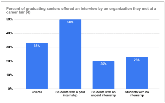 While internships – broadly – are clearly beneficial, there is conflicting research about the importance of whether an internship is paid. NACE has found that while unpaid internships have a positive impact on a student’s academic experience, students with unpaid internships received ~50% fewer job offers than peers who had a paid internship (5). Furthermore, a comparison of whether students were offered an interview from an organization they met at a career fair showed that 50% of students with a paid internship received an interview compared to 20% of students with an unpaid internship and 23% of students with no internship (4).