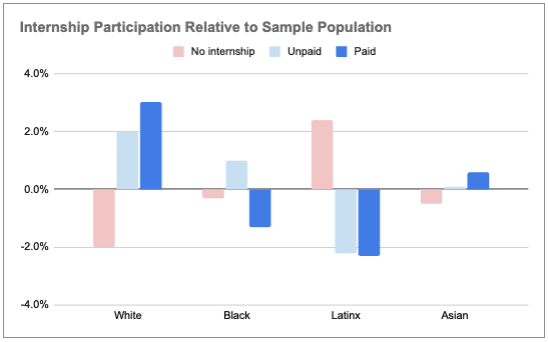 Furthermore, white and Asian-American students were overrepresented in paid internships relative to their survey base. African-American students were overrepresented in unpaid internships relative to their survey base. Hispanic students were overrepresented in the no internships category relative to their survey base (6).